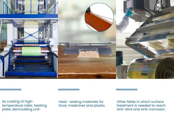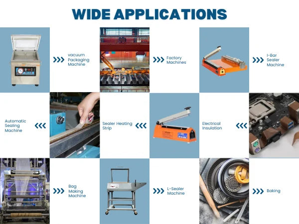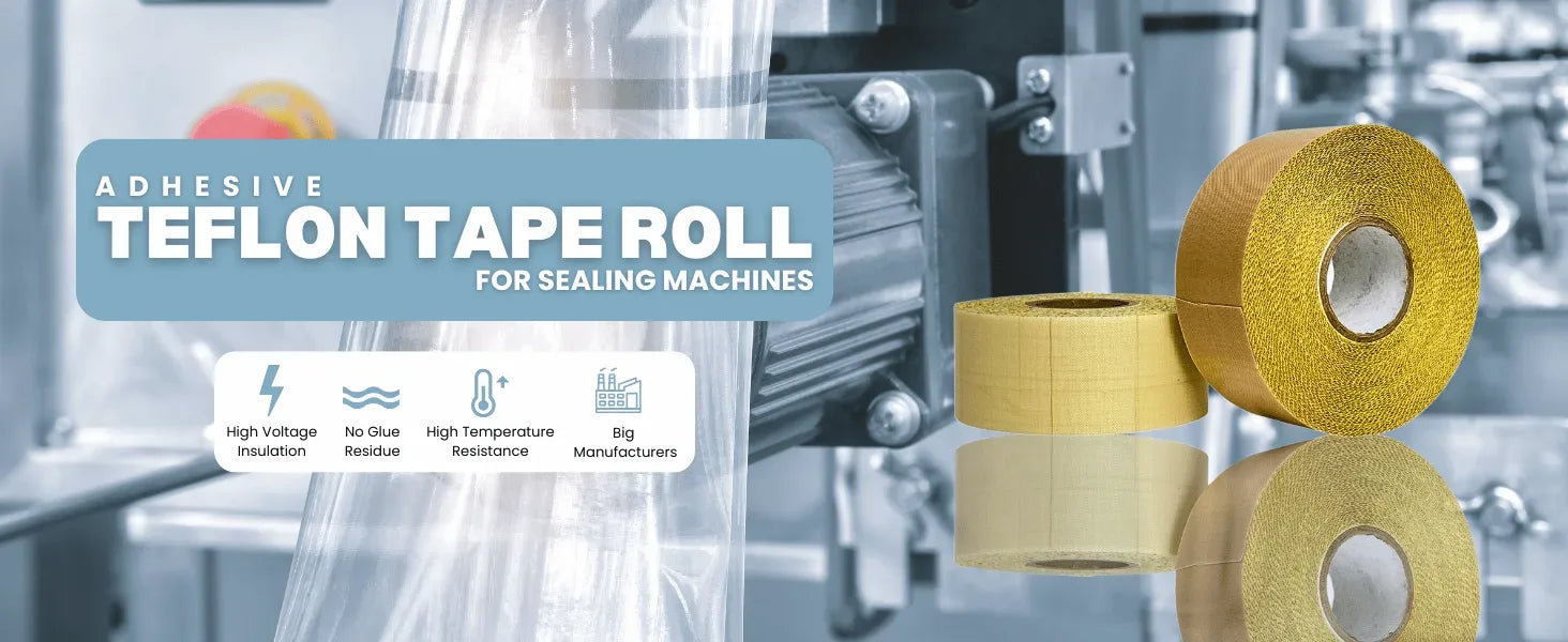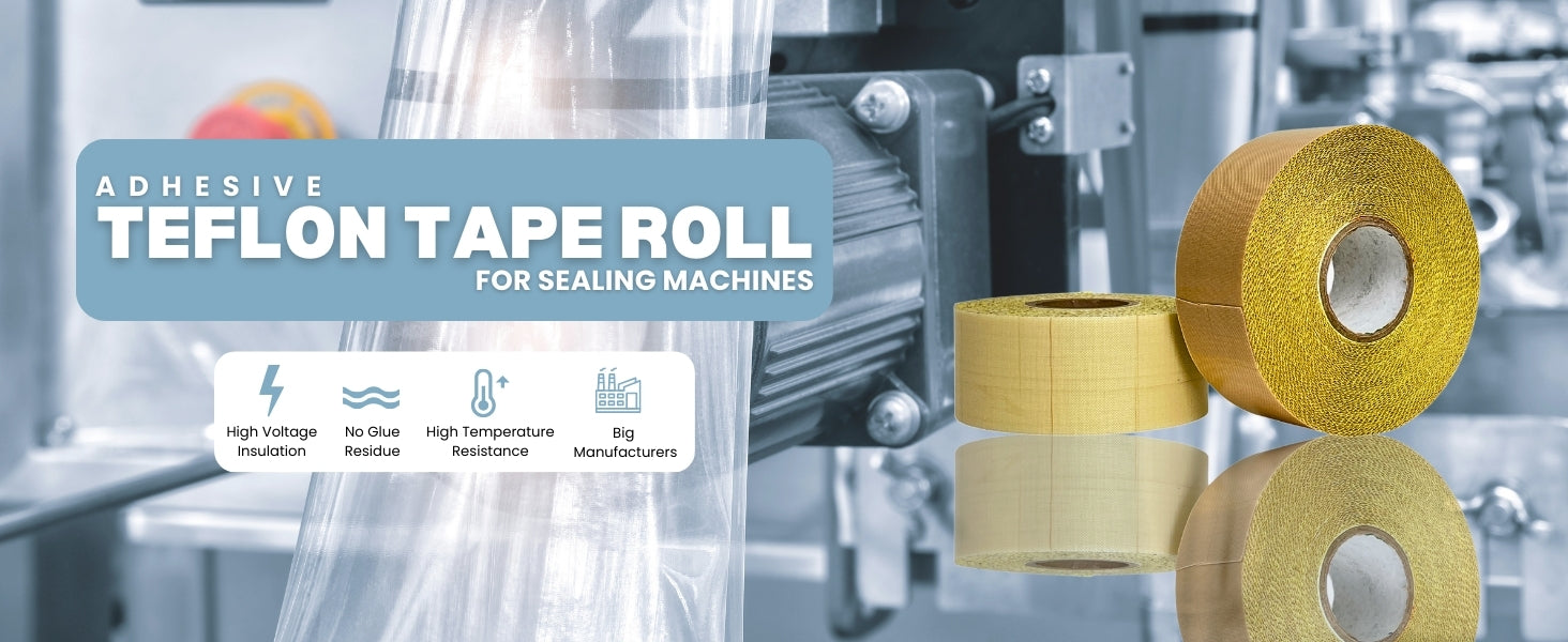 Adhesive Teflon (PTFE) tape is commonly used in sealing machines to provide a non-stick surface, ensuring smooth operation and preventing sealing materials from adhering to the machine's components. A specific product that fits your requirements is the Teflon Tape Roll with Adhesive for Sealing Machines, measuring 4 inches in width and 10 meters in length